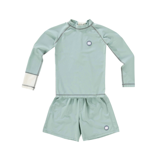 De Matcha kleur straalt rust uit en het contrasterende patroon op de kraag voegt een speels tintje toe. De zwemset is supercomfortabel, droogt snel en is gemaakt van ademende en flexibele stof. Hierdoor krijgt je kind het niet te warm.